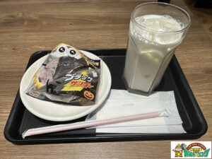 糖分補給しようと、チョコ系のドーナツに牛乳。