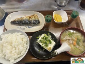 焼き魚(この日は鯖)に、冷奴、たくあん、白米、そして熱々な豚汁。